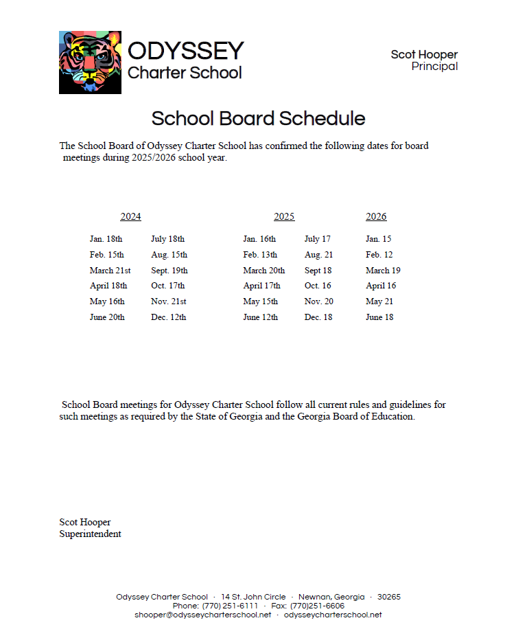 The Governing Board typically meets once monthly to discuss the operation of the school, hear reports and updates from committees, to consider and adopt policies and to hear requests and concerns from committees, parents, students and teachers. Meetings are typically scheduled a semester at a time by the members of the Board. Special meetings may also be called if the need arises. Whenever possible, an agenda is posted one week ahead of the scheduled meeting. All meetings, unless otherwise noted, are held at Madras Park School Building, 2335 Hwy 29 N., Newnan, GA 30265.